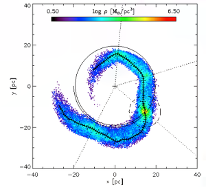 ![]() Figure: Dissolving cluster in the Galactic centre. From: A. Ernst, A. Just, R. Spurzem, On the dissolution of star clusters in the Galactic centre. I. Circular orbits, 2009, MNRAS 399, 141 |