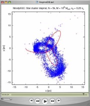![]() Movie: A star cluster spiralling into the Galactic Center on a rosette orbit, N = 5000, M_cl = 10^6 M_sol, V0 = 0.5 V_cir, King W0 = 9 |